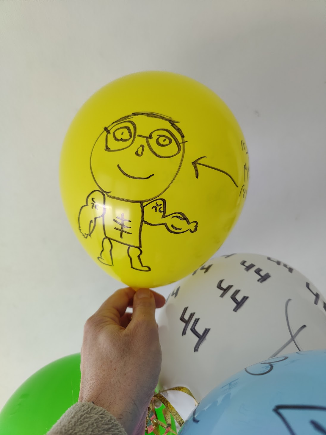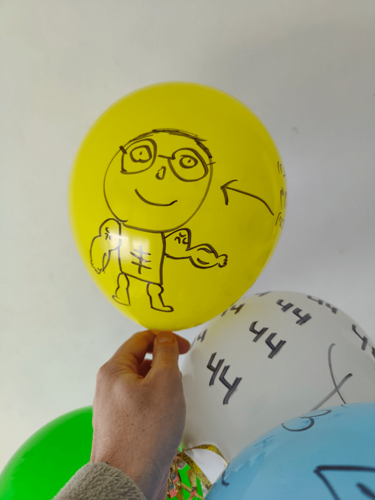 8. לא אעלה תמונה שלי מגיל 21, כי אני מנסה לשחק את המשחק של ״אני אולי נראה כמו סָחִי ומנהל חיים של סחי, אבל אני לא באמת סחי״. במקום זה קבלו את האיור שעל אחד הבלונים שקיבלתי אתמול. מה שלא רואים בתמונה הוא את הכיתוב ״אבא ביום רגיל״. כנראה שילדים לא יודעים לשקר.