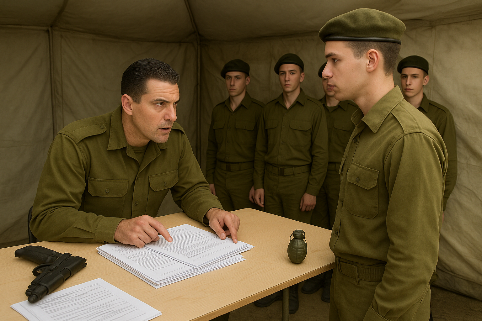 במרכז האוהל מוצב שולחן ועליו ערימות של טפסים. כדי שהדפים לא יעופו הרוח, על כל ערימה מונח אמצעי לחימה שונה: מחסנית, אקדח, רימון וכו׳. לשולחן יושב נגד כבן 40, שיערו המקליש משוח בג׳ל. מול השולחן עומד טור של טירונים. אחד מהם מסיים לחתום על אחד הטפסים ויוצא מהאוהל. החייל הבא בתור ניגש לנגד.