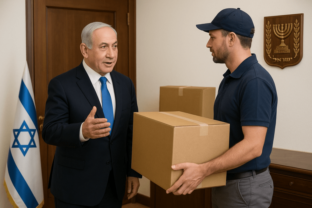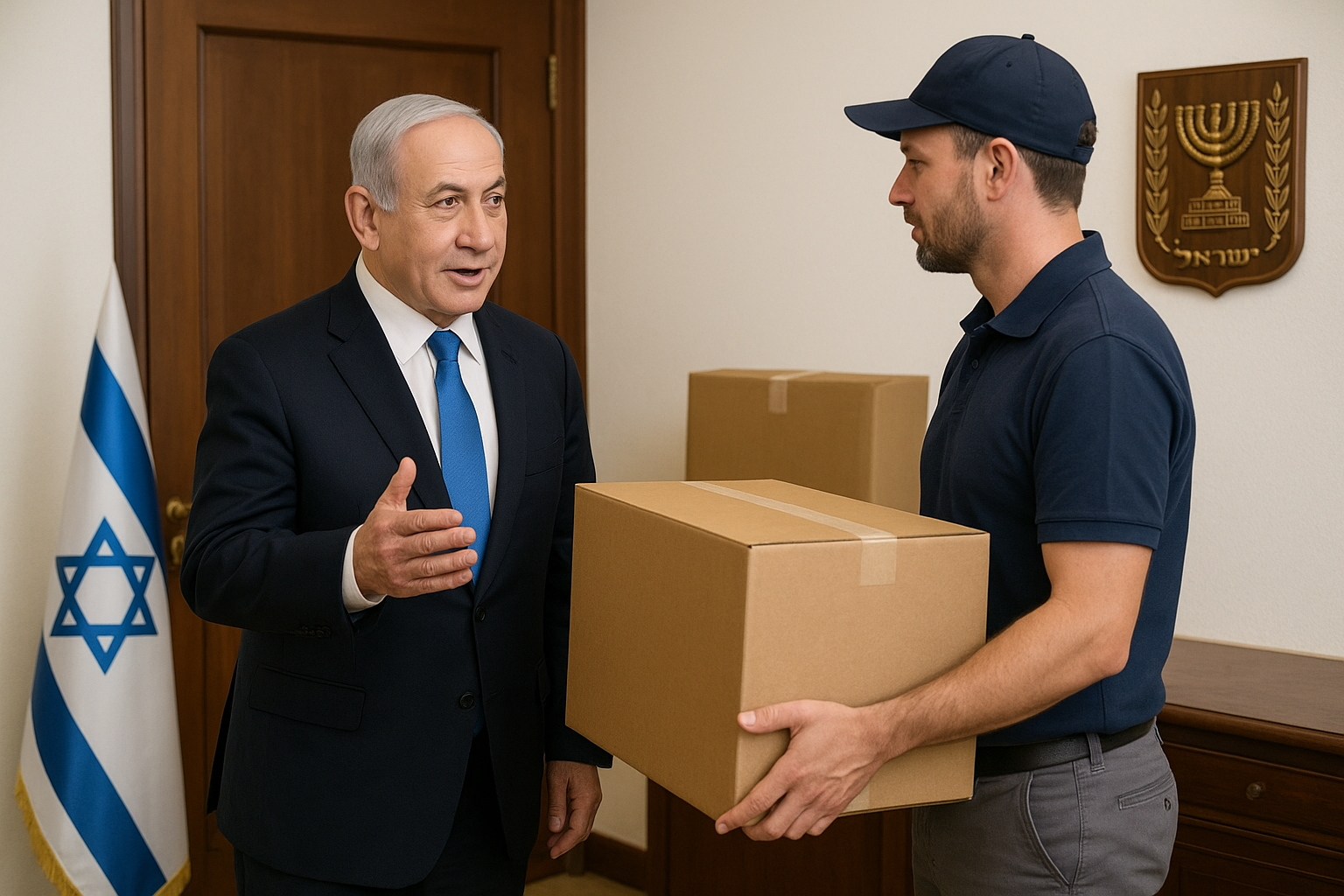 בנימין נתניהו יושב לשולחן, חותם על מסמכים. לפתע נשמעת דפיקה בדלת. הוא מרים את ראשו מהניירות. הדפיקות ממשיכות להישמע. הוא קם ופותח את הדלת. בפתח עומד שליח צעיר. הוא מחזיק בידיו מכשיר אלקטרוני שבעזרתו הוא מחתים לקוחות. מאחוריו קופסה גדולה.